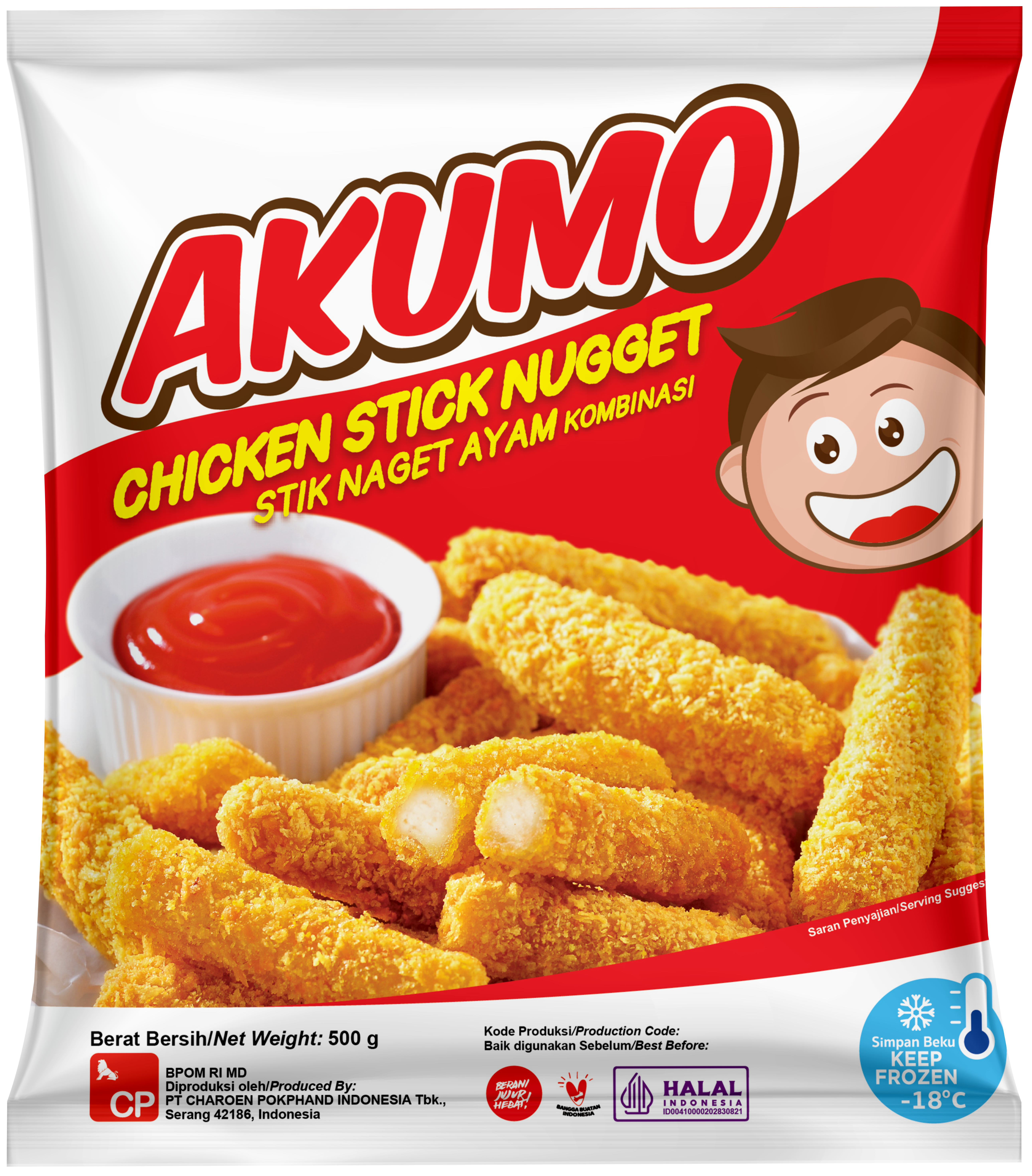 Akumo Stik Naget Ayam tersedia dalam ukuran 250gr, 500gr, dan 1000gr.