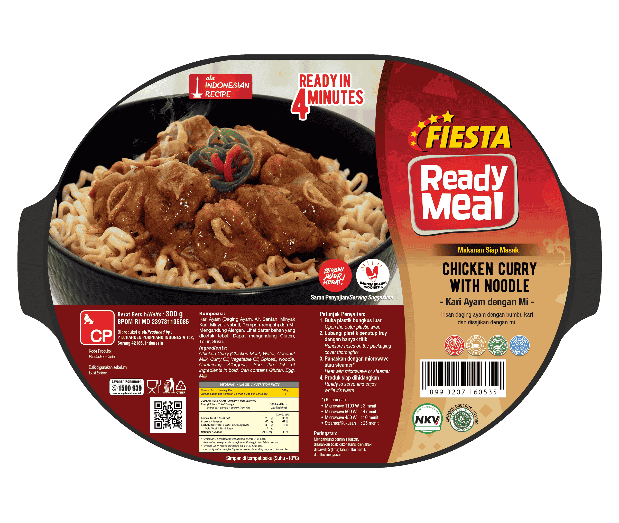 Penuhi kebutuhan nutrisi harian Anda pada Fiesta Ready Meal Chicken Curry With Noodle dengan perpaduan irisan daging ayam, bumbu kari dan di sajikan dengan mie. Tersedia dalam ukuran 300gr.