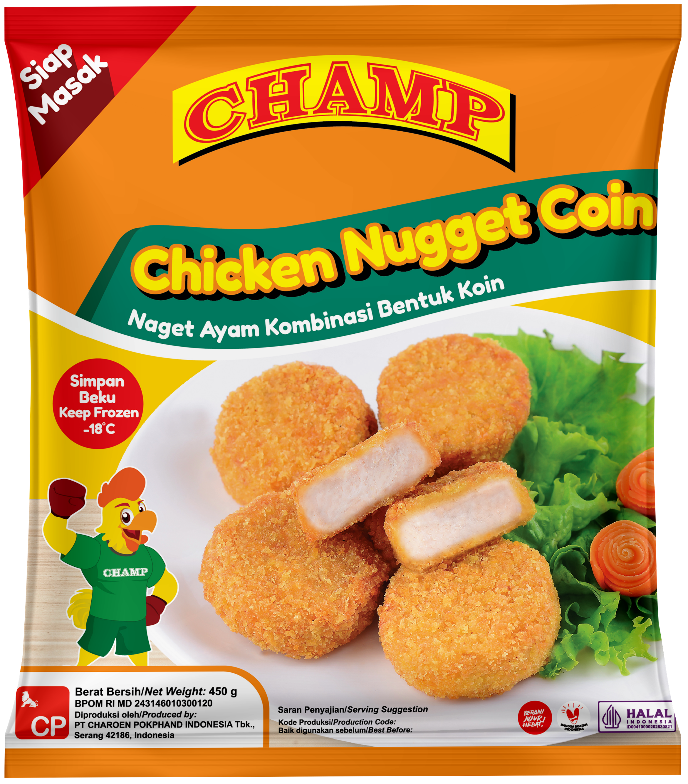 Terbuat dari daging ayam olahan. Berbentuk koin yang berkualitas, bergizi, dan harga terjangkau. Tersedia dalam ukuran 200gr dan 450gr.