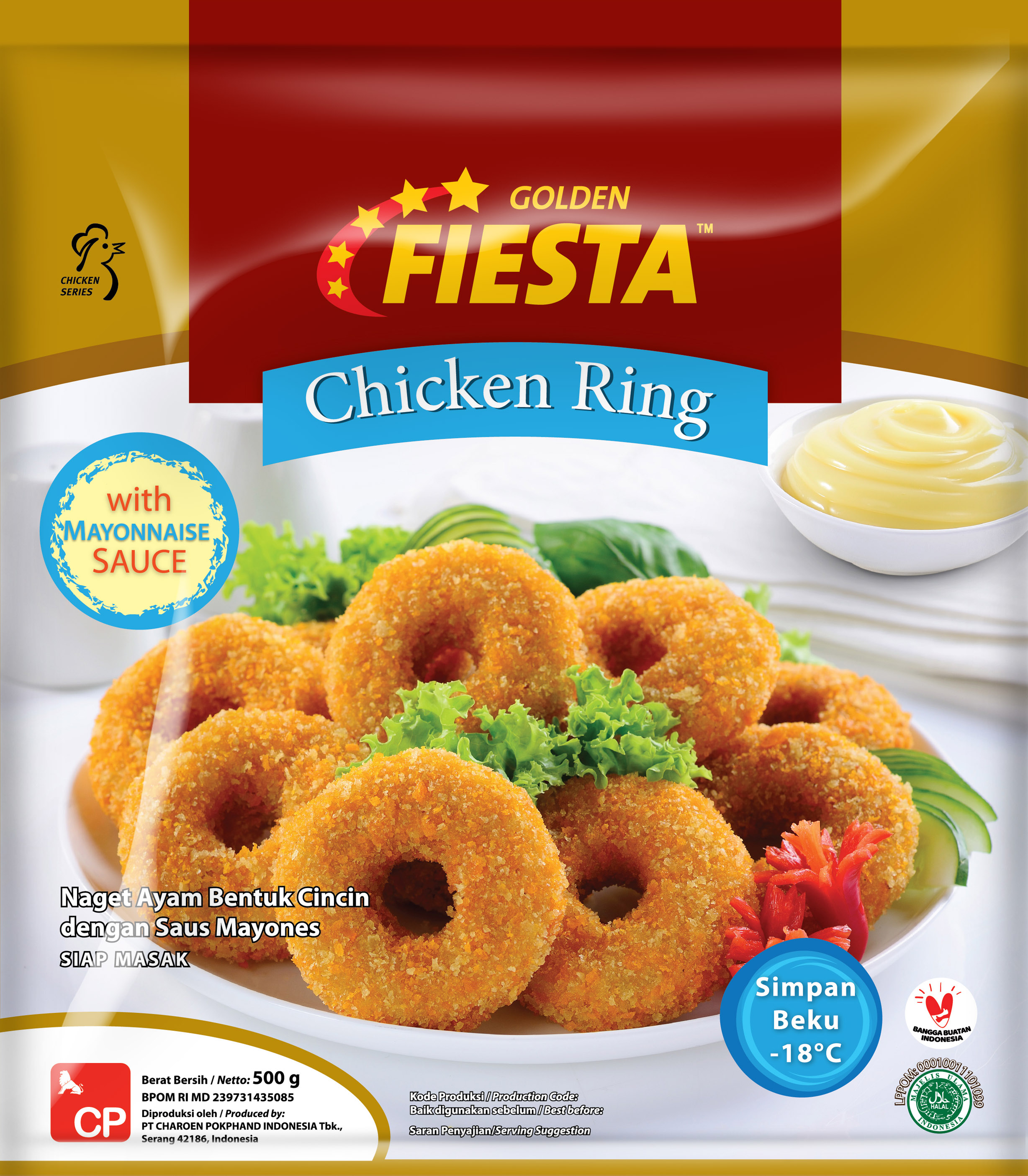 GOLDEN FIESTA Chicken Ring terbuat dari daging dada ayam cincang berbentuk cincin dengan saus mayonnaise. Tersedia dalam ukuran 500gr.