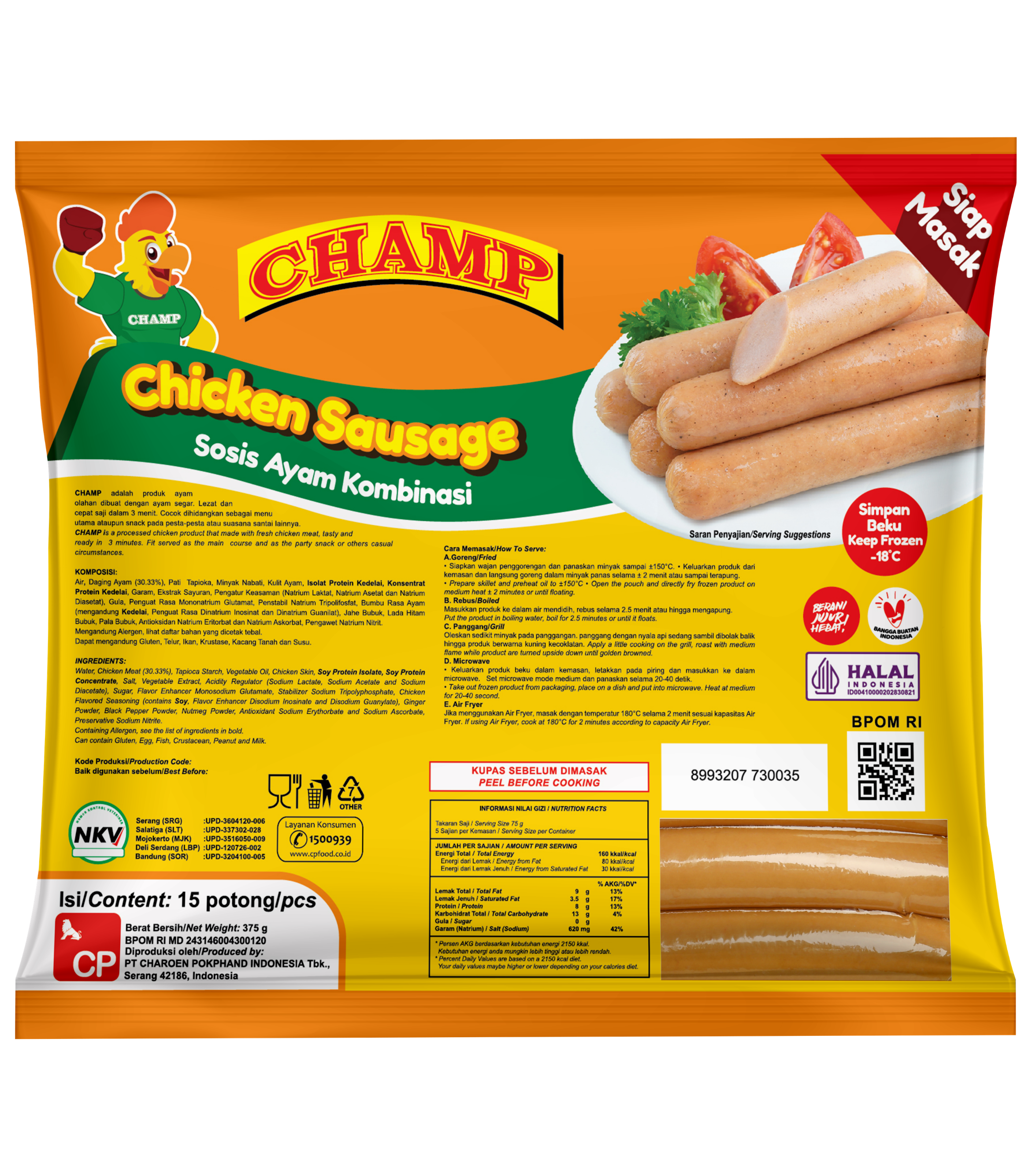Champ Chicken Sausage merupakan sosis ayam yang terbuat dari daging ayam pilihan dengan aroma yang khas dan rasa yang sangat enak. Tersedia dalam ukuran 75gr, 150gr, 375gr dan 1000gr.
