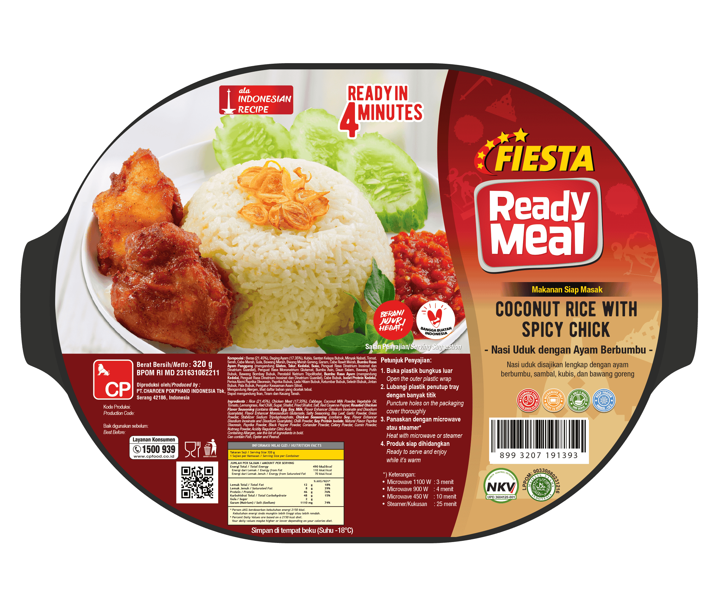 Fiesta Ready Meal Coconut Rice With Spicy Chick adalah nasi uduk yang disajikan lengkap dengan ayam berbumbu, sambal, kubis, dan bawang goreng. Tersedia dalam ukuran 320gr.