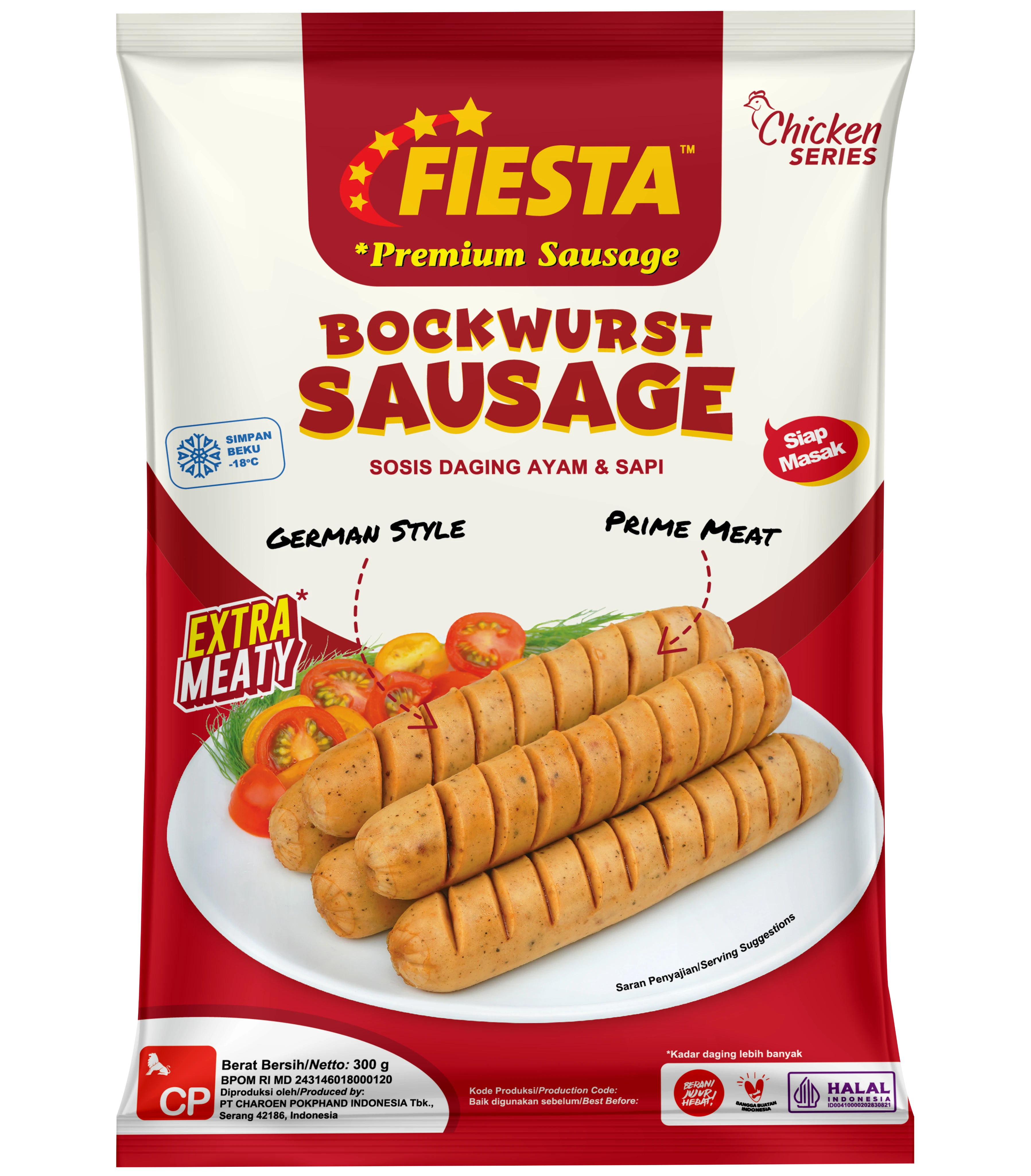 Fiesta Bockwurst Sausages merupakan sosis yang terbuat dari daging ayam & sapi pilihan dengan bumbu pilihan dan rasa yang sangat enak. Tersedia dalam ukuran 300gr.