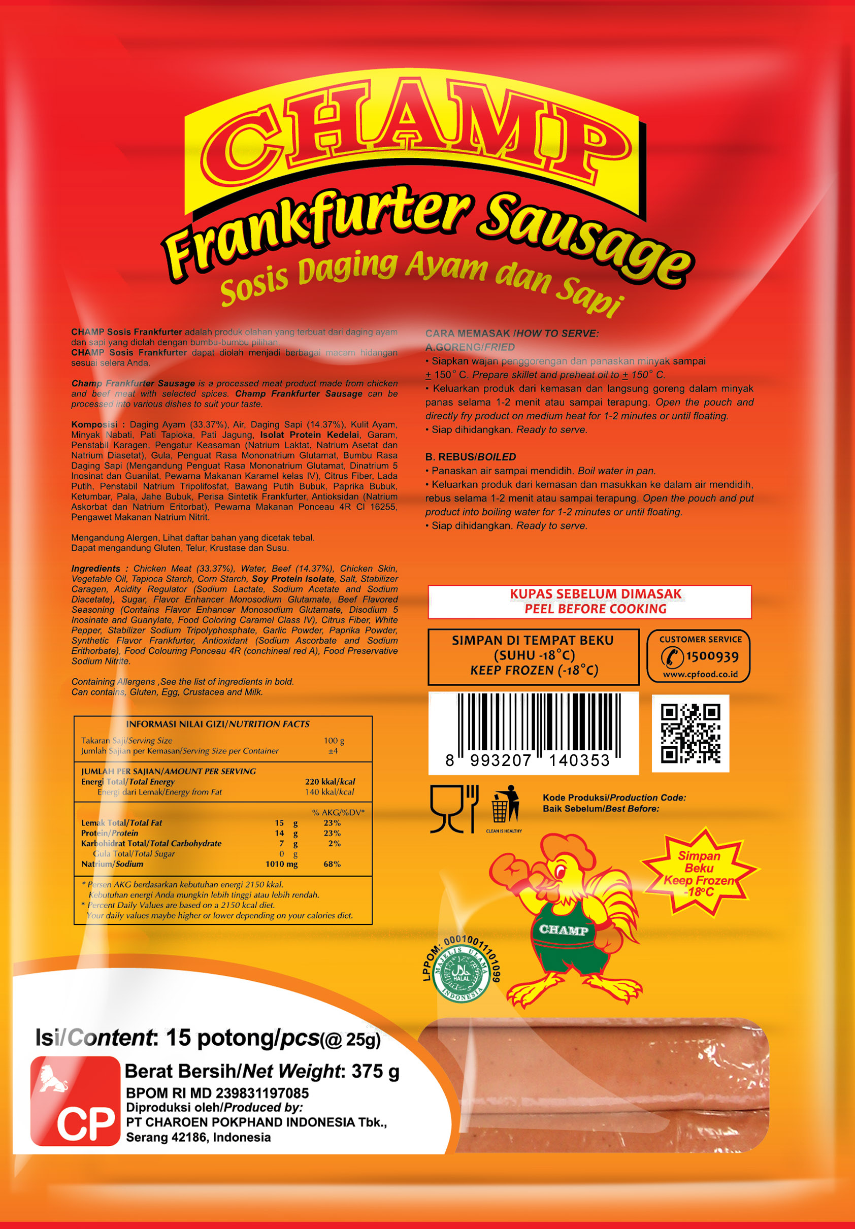 Champ Frankfurter Sausage merupakan sosis yang terbuat dari daging ayam dan sapi pilihan dengan aroma yang khas dan rasa yang sangat enak. Tersedia dalam ukuran 375gr.