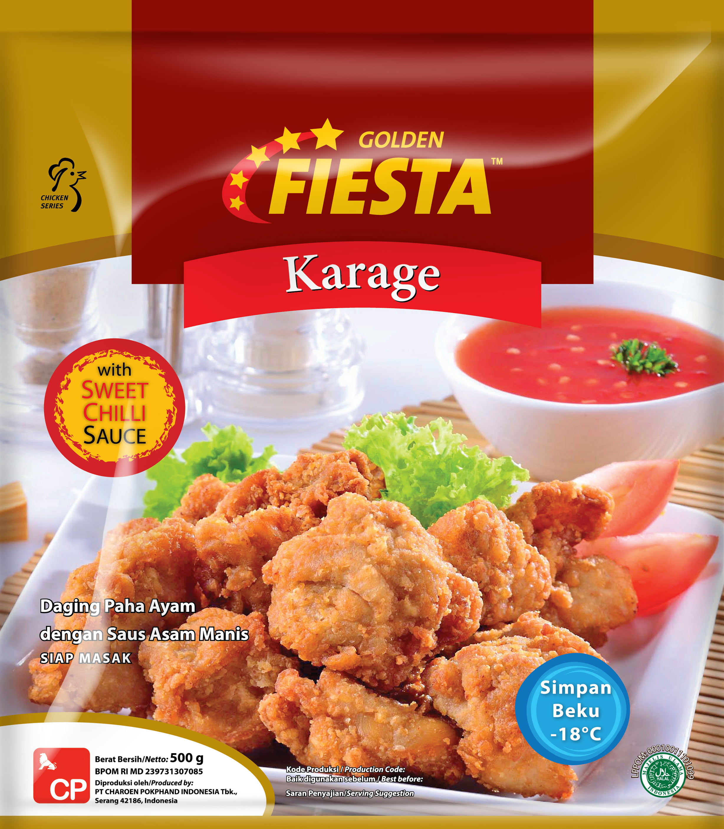 GOLDEN FIESTA Karage With Sweet Chilli Sauce terbuat dari potongan daging ayam segar pilihan, dilengkapi dengan saus pedas manis. Tersedia dalam ukuran 500gr.