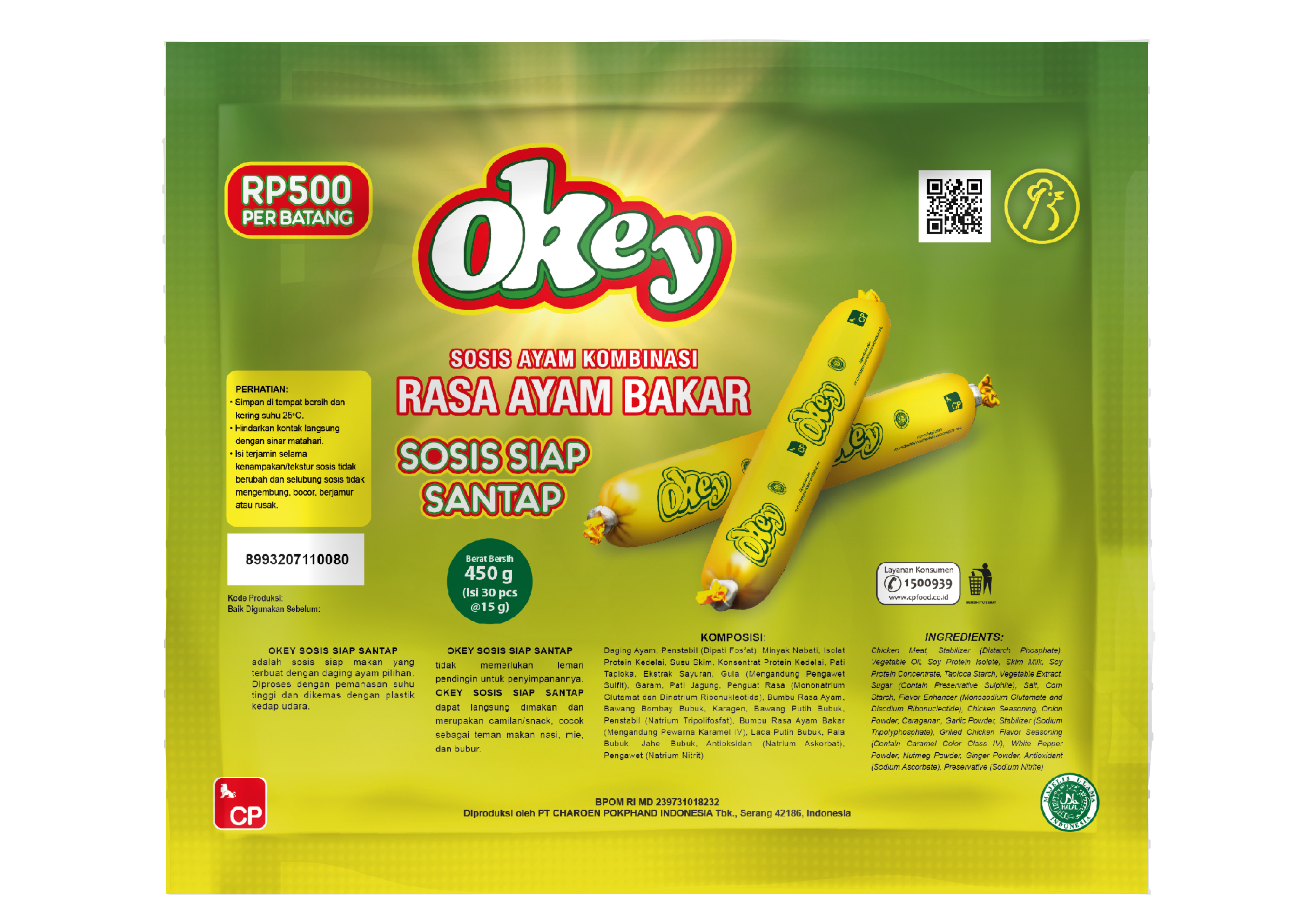 Sosis Siap Santap kombinasi rasa Ayam Bakar isi 30 pcs. Tersedia dalam ukuran 450gr