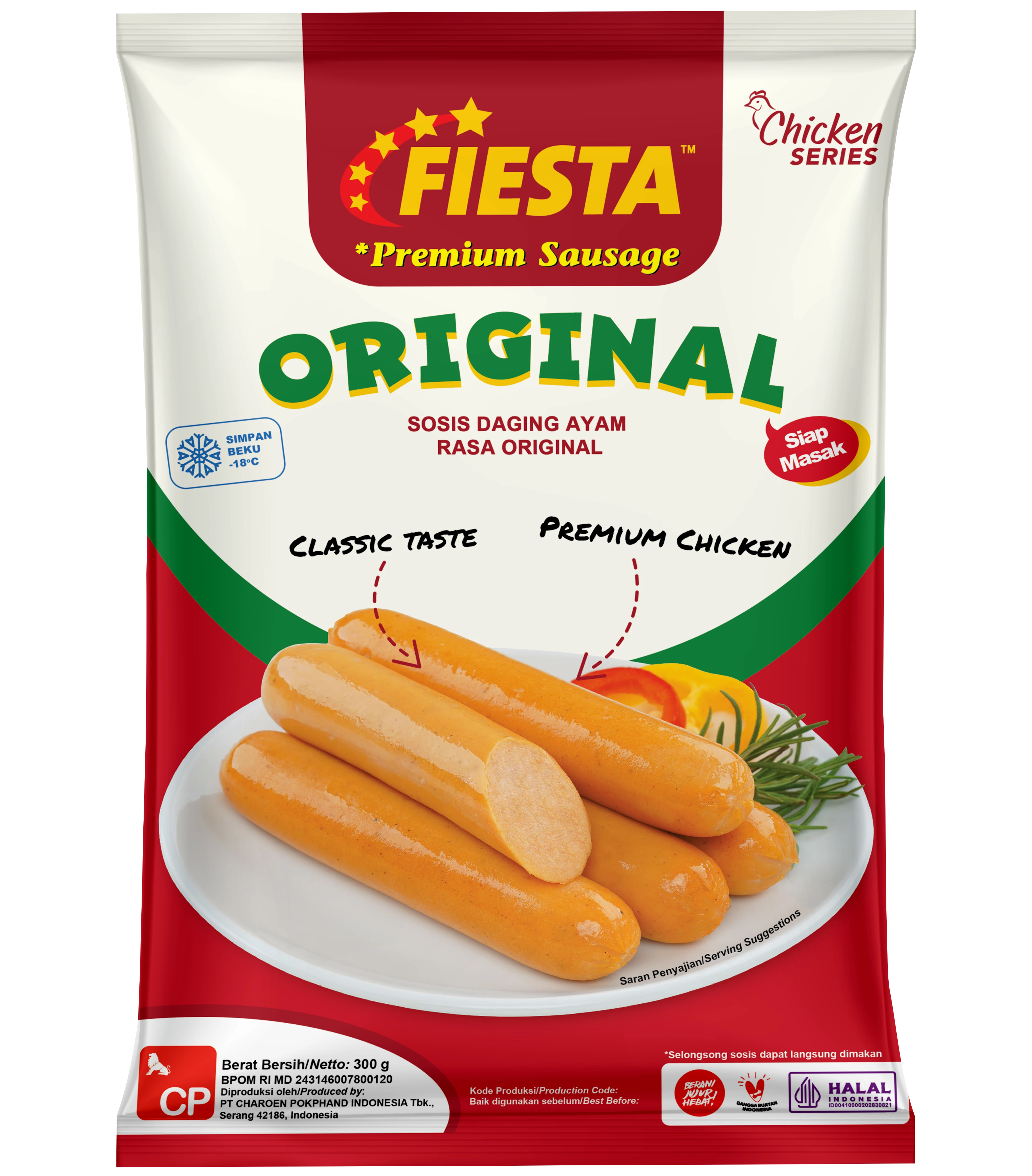Fiesta Original Sausages merupakan sosis yang terbuat dari daging ayam pilihan dengan bumbu pilihan dan rasa yang sangat enak. Tersedia dalam ukuran 300gr.