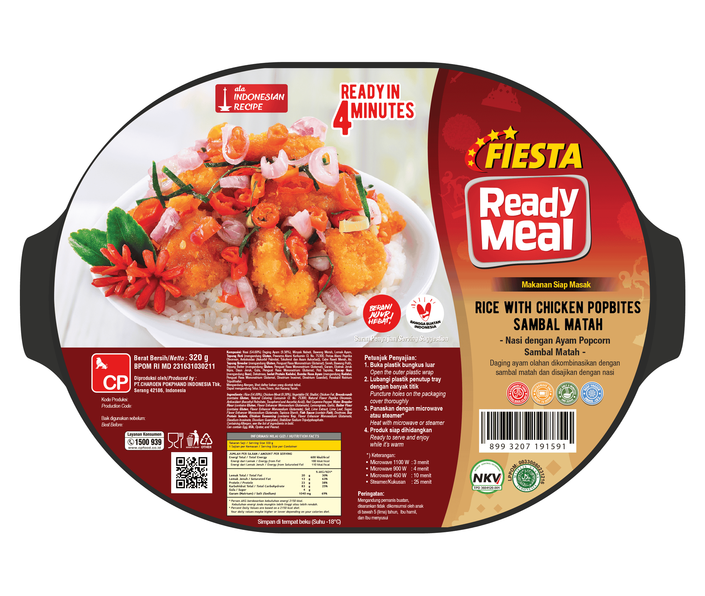 Fiesta Ready Meal Rice With Chicken Pop Bites Sambal Matah adalah ayam goreng pop bites dengan sambal matah khas bali yang disajikan lengkap dengan nasi. Tersedia dalam ukuran 320gr.