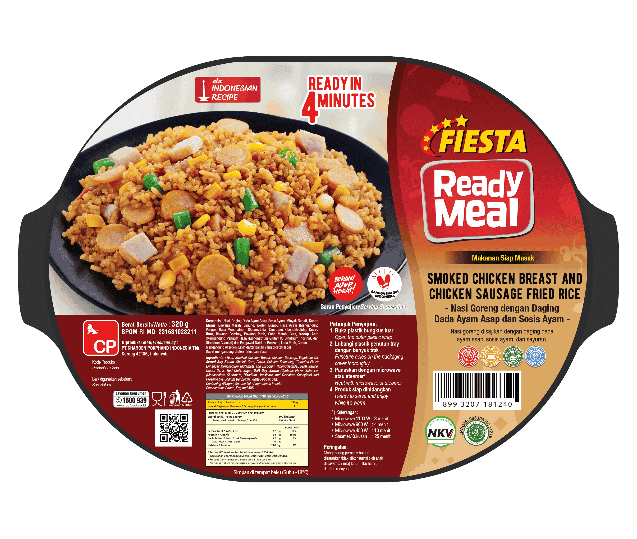 Fiesta Ready Meal Smoked Chicken Breast And Chicken Sausage Fried Rice adalah nasi goreng yang disajikan lengkap dengan daging dada ayam asap, sosis ayam, dan sayuran. Tersedia dalam ukuran 300gr.