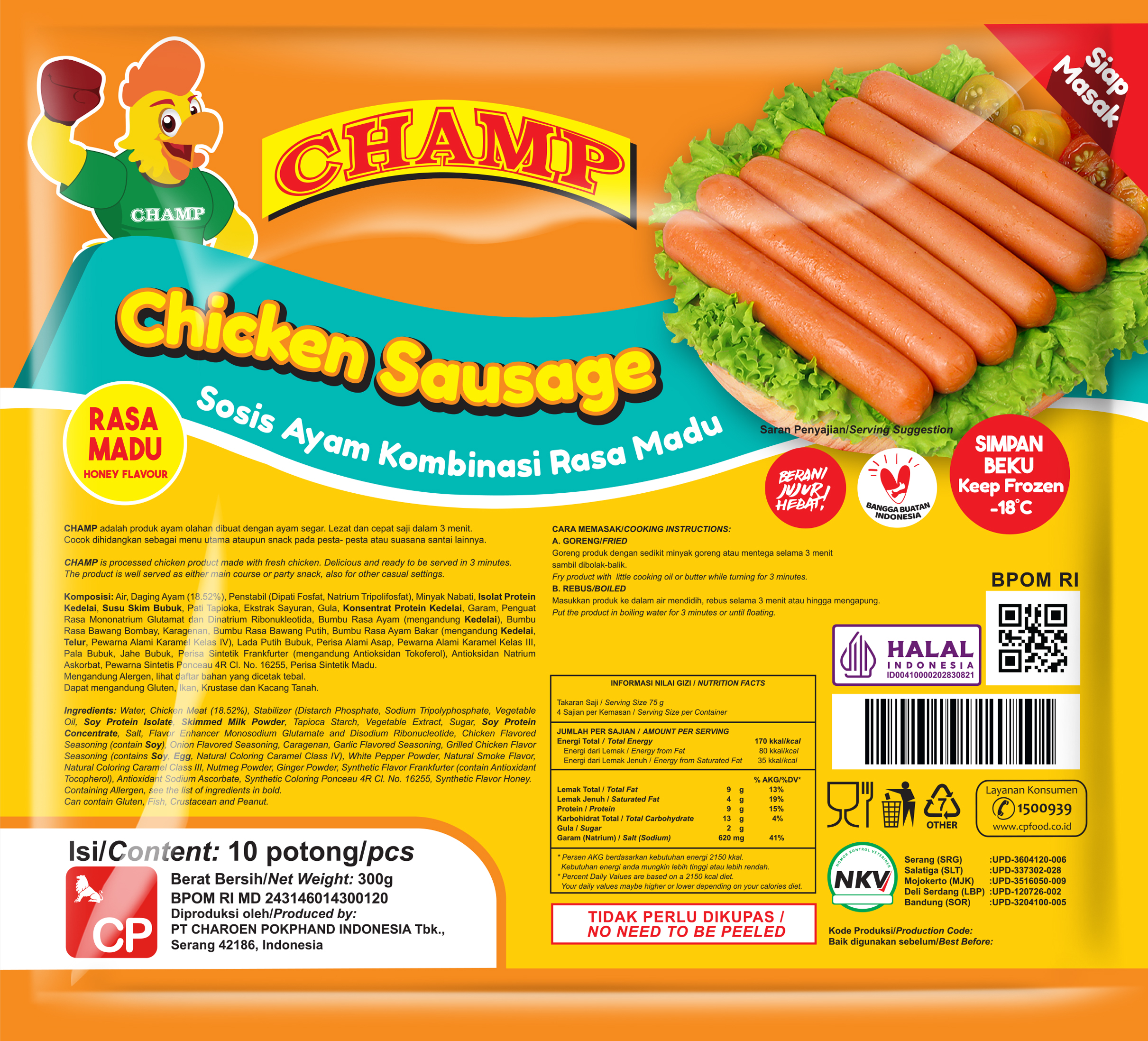Sosis Ayam Rasa Madu terbuat dari daging ayam pilihan, diolah dengan bumbu-bumbu dan dengan tambahan rasa madu. Memiliki rasa yang enak, aroma yang khas, tekstur yang kenyal, serta bisa langsung diolah tanpa perlu dikupas. Tersedia dalam ukuran 300gr