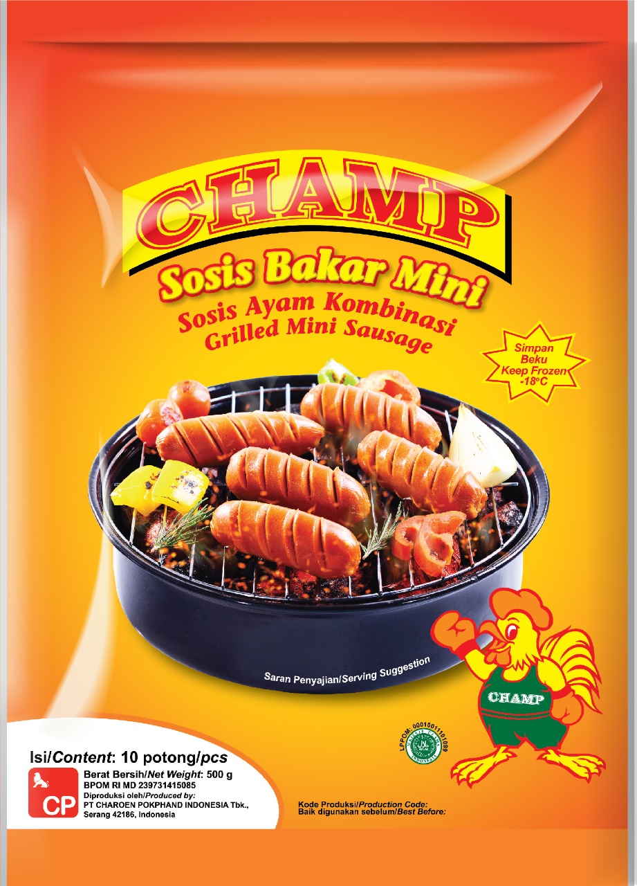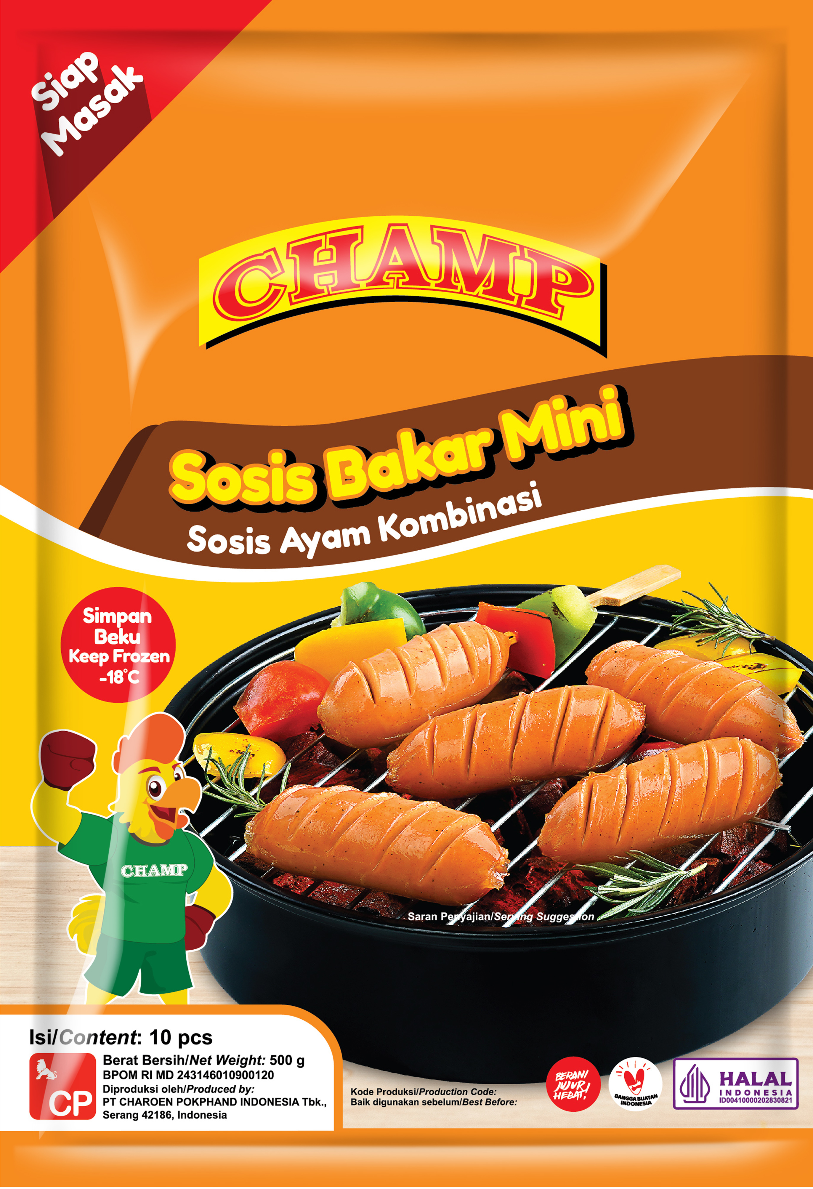 Champ Sosis Bakar Mini terbuat dari daging ayam yang diolah dengan bumbu pilihan dan menggunakan pelindung sosis collagen sehingga dapat langsung diolah tanpa perlu dikupas. Dapat diolah menjadi berbagai macam hidangan sesuai selera, baik dibakar atau digoreng. Tersedia ukuran 500gr.