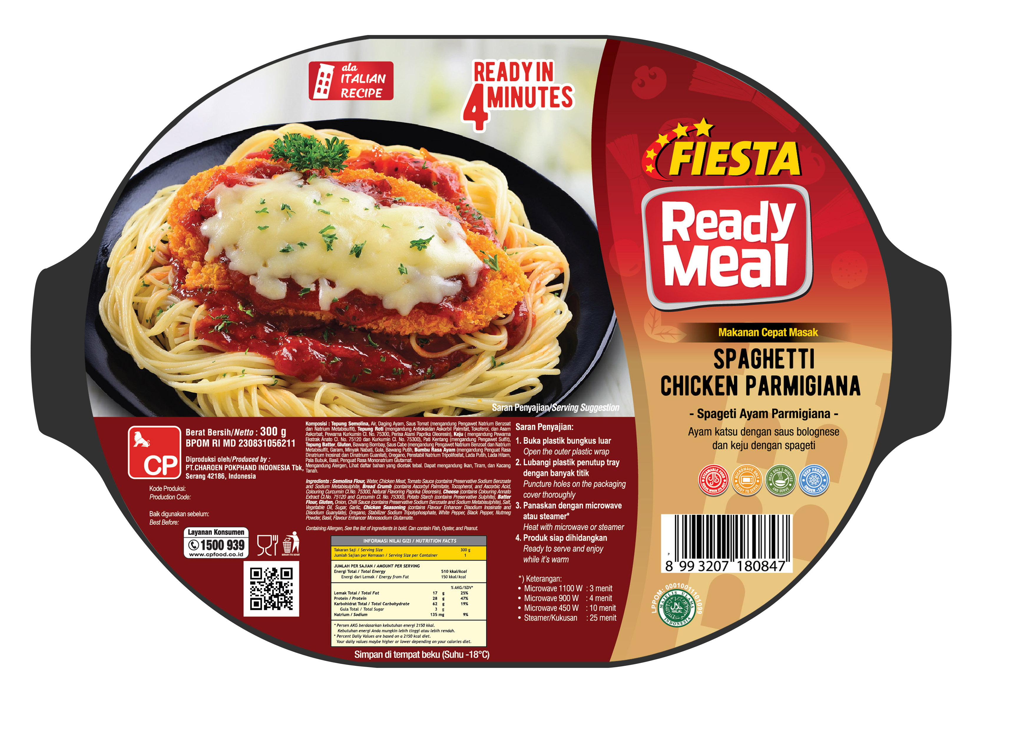 Penuhi kebutuhan nutrisimu dengan Fiesta Ready Meal Spaghetti Chicken Parmigiana. Tersedia dalam ukuran 300gr.