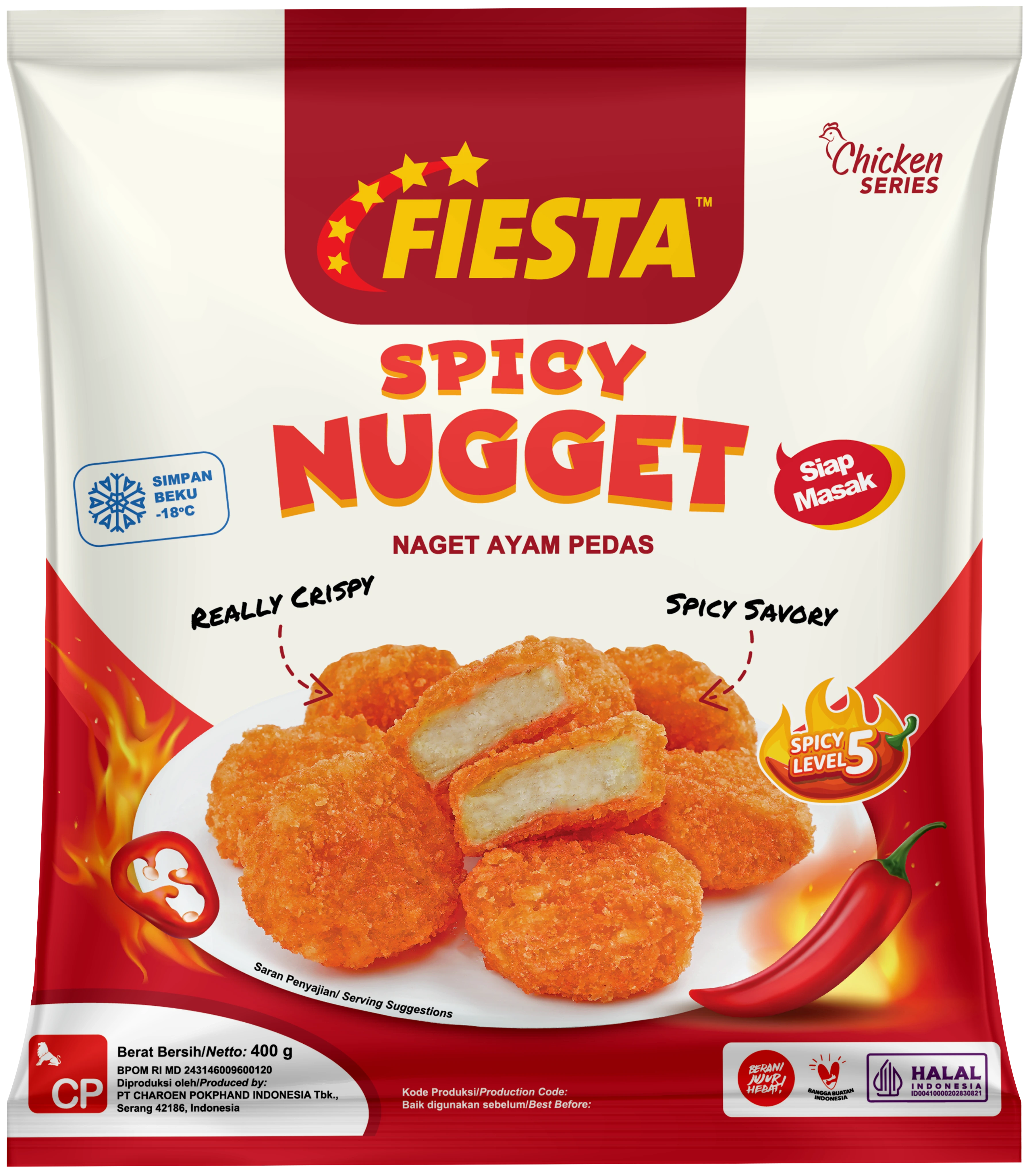 Naget ayam rasa pedas terbuat dari daging dada ayam cincang yang renyah dan terasa tekstur dagingnya, berbentuk koin dan rasa pedas dari minyak cabai dan lada. Tersedia dalam kemasan 500 gr.